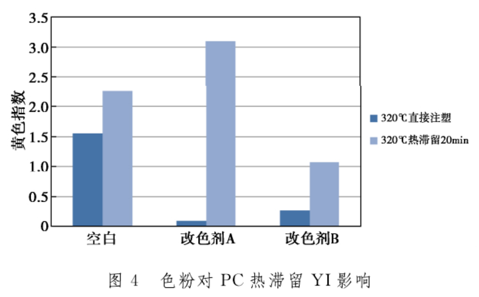 从图4中可以看出,2种色粉以相同量添加均可以大幅降低聚碳酸酯的YI值,但经过320℃下20分钟热滞留后,色粉A的色差发生较大的反弹,而色粉B的变化幅度与空白颗粒相当,说明不同种类的色粉在短时间高温加工下应用效果和长时间高温停留有较大的差异,可能会导致聚碳酸酯高温加工严重变色。