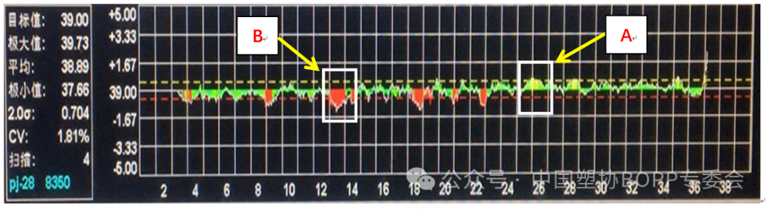 “阴天”的厚度形态是一种最糟糕的厚度状态,薄膜的横向厚度起伏较大,厚度“死点”的地方比较固定,厚度偏差值随时间的变化不大,相邻两点的厚度差基本上在 0.5um 以上,标准偏差 2δ 值大于 1.3%,敲击时,厚度高点很硬,低点很软,且持续的时间很长,一旦出现就是批量降级。这种情况往往需要人工干预后才能恢复正常,但这种情况产生的原因复杂,解决起来较为麻烦。这种情况的产生的厚度缺陷,往往位置比较固定,短期内不会消失,且会日益加剧,因此。把这种因素可概括为非流动性因素。